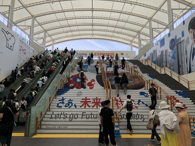 さて、いよいよ当日の朝を迎えました。長女と私は手早く用意を済ませ朝食を急いでいただきホテルを後にしました。予定通りにJR新今宮駅➯西九条乗り換え➯桜島駅で下車し、万博のシャトルバスの乗り場へと急ぎました。